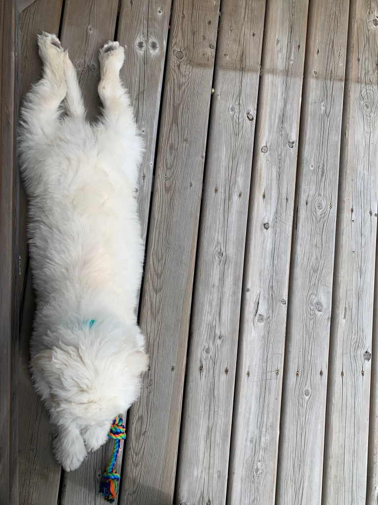 His mom is a Sheepadoodle, and his dad is a cross between a Great Pyrenees and a Maremma Sheepdog. It’ll be interesting to see which breed he looks the most like, but so far I think the Great Pyrenees breed is dominating.